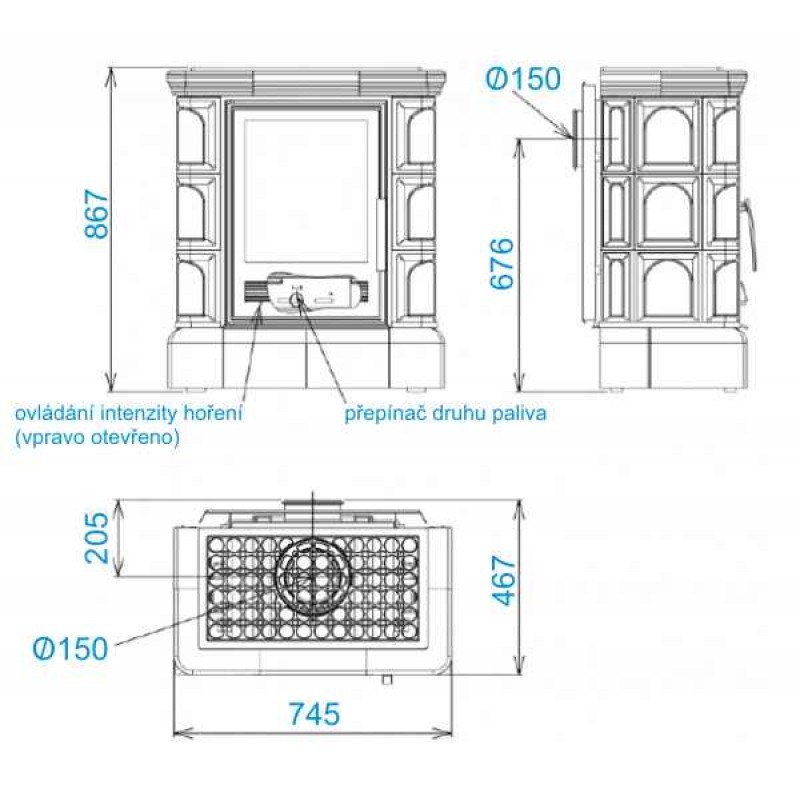 Verwendbare Brennstoff: Holz, Holzbriketts / Braunkohlbriketts
