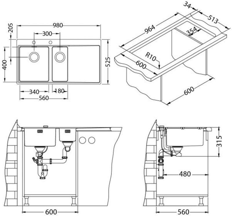 - Beckengröße: 340 x 400 x 205 / 180 x 400 x 150 mm