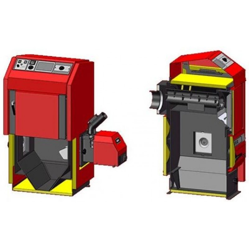 Der Kessel ist so gebaut, dass in die linke oder rechte Seite des Kessels nach dem Bedarf des Kunden ein Brenner für Pellets eingebaut ist, der mittels einer Förderschnecke die Pellets aus dem Behälter automatisch abnimmt. Der Brennstoffbehälter ist neben dem Kessel oder im Nebenraum eingebaut und kann von beliebiger Größe sein (standardmäßig 250, 500 oder 1000 l).