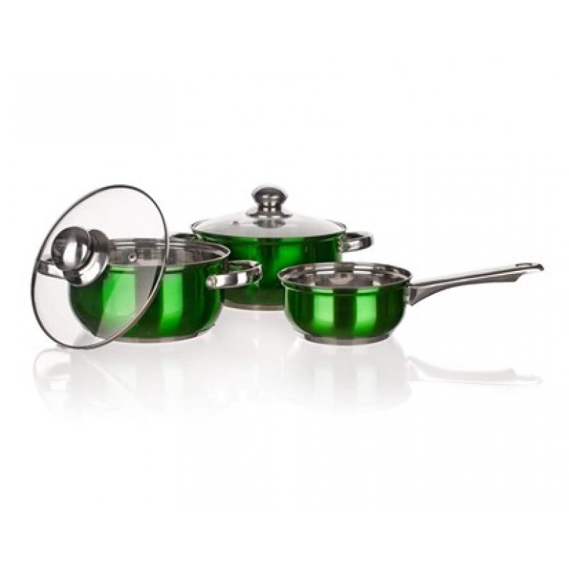 BANQUET 5-teiliges Edelstahl- Geschirr Maestro Green 48HF09GC055 – teiliges Set Kochgeschirr MAESTRO GREEN. Inhalt: 14x6.5cm Kochtopf ohne Deckel, 18x8.5cm Topf mit Deckel, 20x9.5cm Topf mit Deckel. Körper: 0,50 mm Edelstahl 201, 0,50 mm Edelstahlboden 0,50 mm + 1,0 mm Aluminium + Eisen + Induktionsschutz 18/0. Griffe sind an dem Körper des Topfes angeschraubt. Grüne Farbe.
