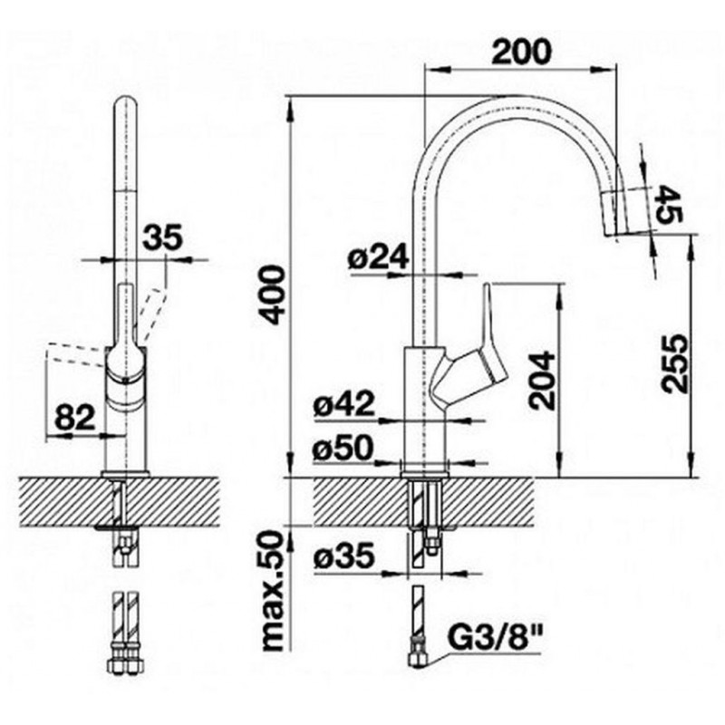 - Flexible Anschlussschläuche mit 450 mm Länge und 3/8“ Mutter für besonders leichte und sichere Montage