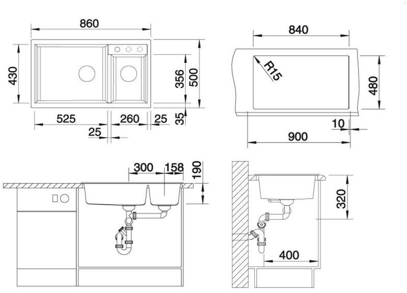 - Beckenabmessungen: 525 x 430 mm; 260 x 356 mm