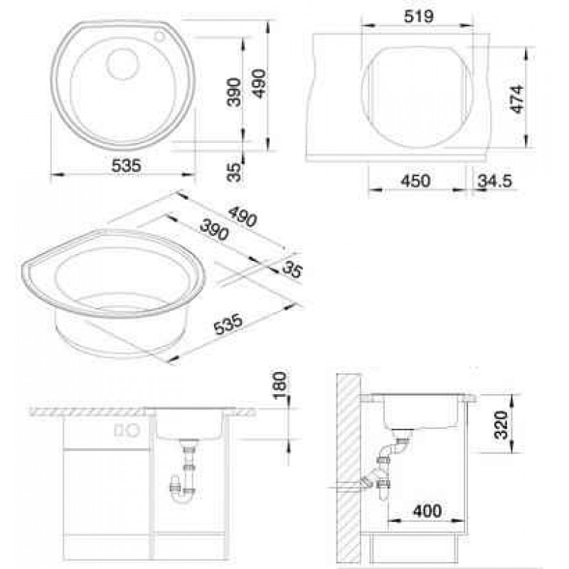 Abmessungen: Durchmesser 535 mmSpülbecken: Durchmesser 390 mm x 180 mm