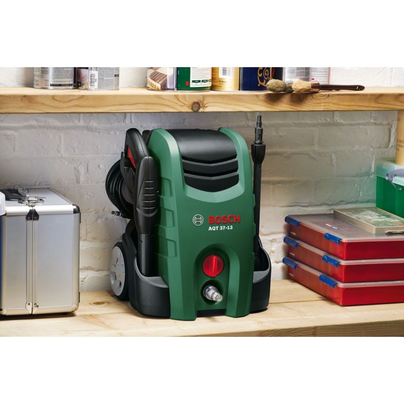 BOSCH AQT 37-13 Pressure Washer 13 Set with 6 m Hose Box, Flow Rate: 370L/H, 06008A7203Der Bosch AQT 37-13 – robuste Konstruktion mit zusätzlicher Leistung für den Allround-Einsatz.