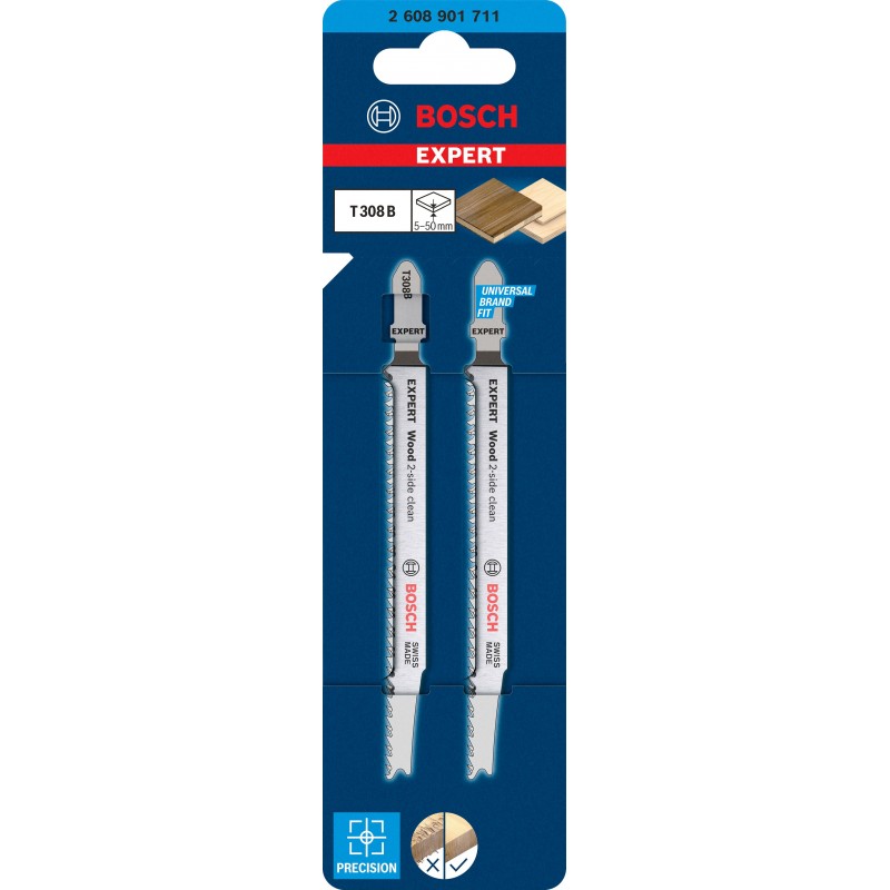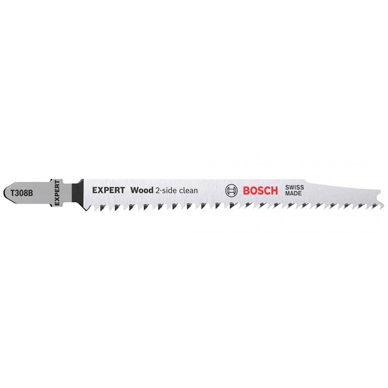 Mit seinen besonders scharfen, präzisionsgeschliffenen Zähnen eignet sich das Bosch EXPERT Wood 2-side clean-Stichsägeblatt gut zum Schneiden von Weichholz mit einer Dicke von bis zu 50 mm. Möbelschreiner können ein perfektes Ergebnis erzielen und verlieren nicht nach jedem Stichsägenschnitt Zeit durch Schleifen. Erhältlich für gerade Schnitte (T308B), für Kurvenschnitte (T308BO) und für genaue Winkelschnitte (T308BP).