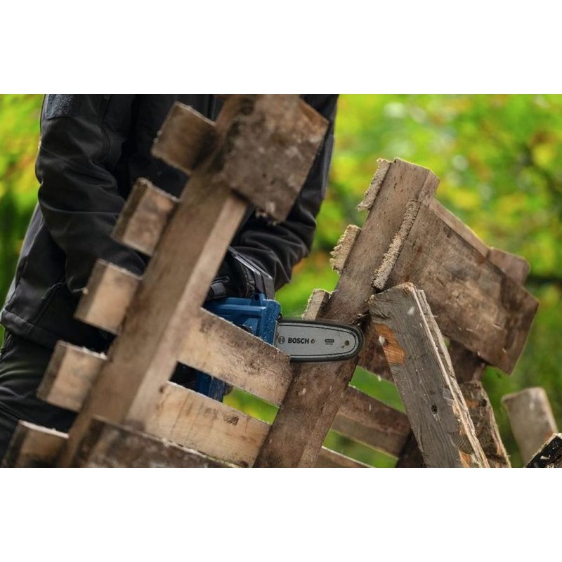 Kettensägen können groß und unhandlich sein, besonders wenn auf engstem Raum gearbeitet wird. Die Bosch GKE 18V-15 Professional Astsäge ist sowohl leicht als auch kompakt und eignet sich perfekt für Arbeiten an schwer zugänglichen Stellen. Der bürstenlose Motor liefert kraftvolle Leistung und sorgt für eine lange Lebensdauer. Das automatische Kettenschmiersystem verbessert die Leistung weiter, indem die Kette immer geschmiert bleibt. Diese Astsäge wurde auch mit Blick auf eine verbesserte Kontrolle entwickelt: Sie verfügt über einen Gyrosensor, der die Bewegung überwacht und die Kettenbremse auslöst, wenn ein potenzieller Rückschlag erkannt wird.