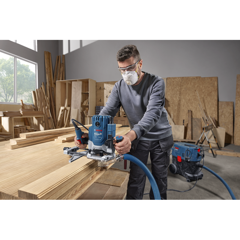 Ergonomisch geneigte Griffe mit Softgrip, leicht erreichbare Bedienelemente und ein effizienter Staubabsaugungsanschluss machen die GOF 20-12 zu einem zuverlässigen Werkzeug für den täglichen professionellen Einsatz in Werkstatt und Montage.