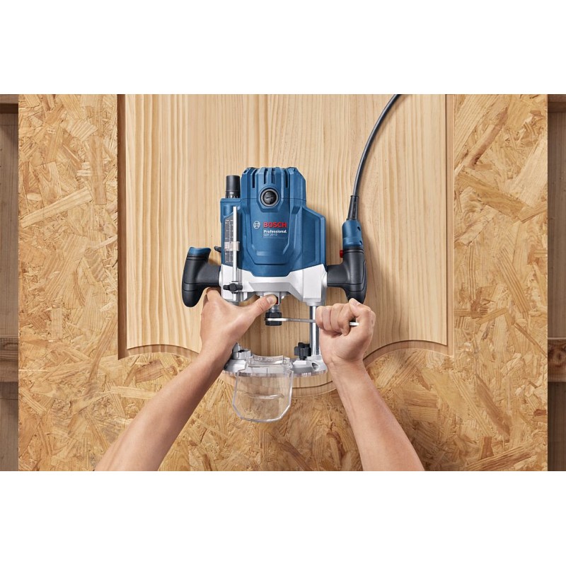Dank der stabilen Konstruktion, der präzisen After-Lock-Tiefenverstellung und der verlängerten Führungsplatte bietet die Maschine maximale Kontrolle. Sie eignet sich ideal für tiefe Nuten, Falze, Schablonenarbeiten, das Bündigfräsen von Platten sowie das Profilieren von Kanten.