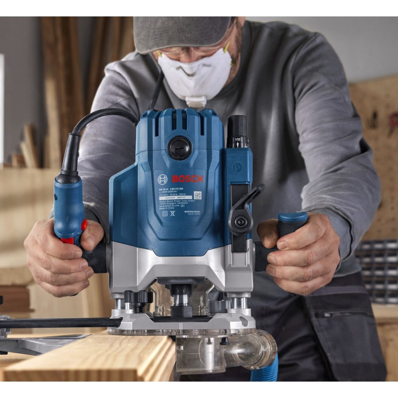 Die GOF 20-12 ist mit einem Drehzahlwahlschalter auf der linken Seite, einem arretierbaren Schalter am rechten Griff, einem leicht erreichbaren Tauchhebel sowie speziellen Adaptern zur Staubabsaugung für das Fräsen von Flächen und Kanten ausgestattet.