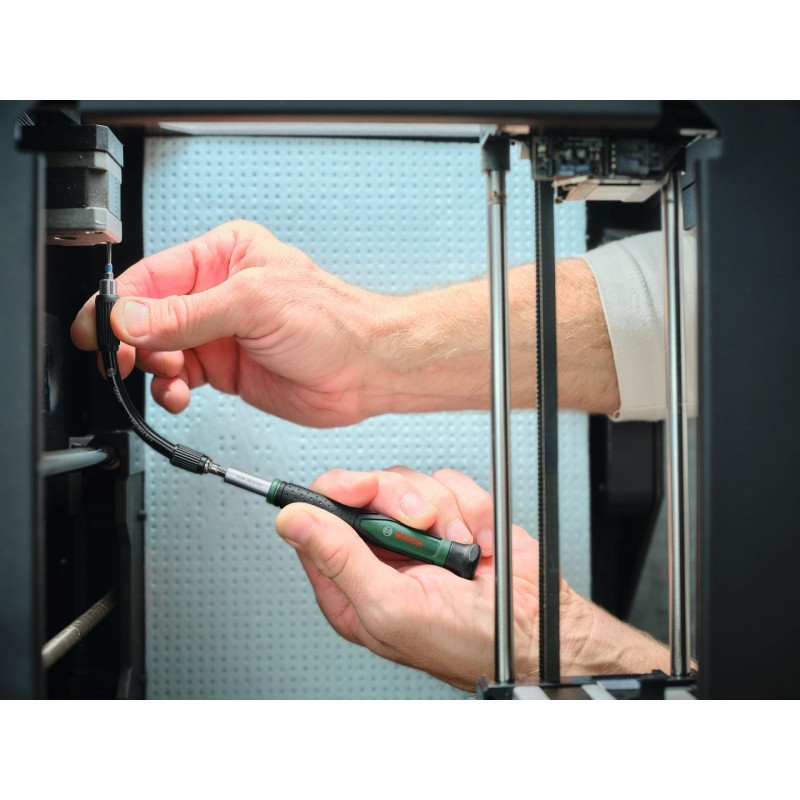 Mit dem 20-teiligen hochwertigen Bosch Präzisionsschraubendreher-Set lassen sich kleine elektronische Geräte, Brillen, Laptops oder Uhren schnell und effizient reparieren. Der Präzisions-Bit-Schraubendreher verfügt über ein schlankes, ergonomisches Design mit weichem Griff und drehbarer Kappe für bessere Handhabung und Komfort. Dies ermöglicht ein leichtes und schnelles Drehen und bietet gleichzeitig optimale Kraft für kontrolliertes, präzises Schrauben. Dank des starken magnetischen Bithalters im Schaft bleibt der Bit fest an Ort und Stelle. Ein Wegrollen wird durch das sechseckige Griffende verhindert. Das Set enthält 20 Präzisions-Bits (PH000/00/0, SL1,5/2/2,5, TX2/3/4/5/6, TH8, HEX1,5/2, U2,6, Y1, Pentalobe 0,8/1,2, Dreieck 2/2,3), eine normale Verlängerung, eine flexible Verlängerung und eine praktische Pinzette zum feinen Greifen. Es ist in einem praktischen Kunststoffkoffer untergebracht, der die Aufbewahrung und den Transport erleichtert.