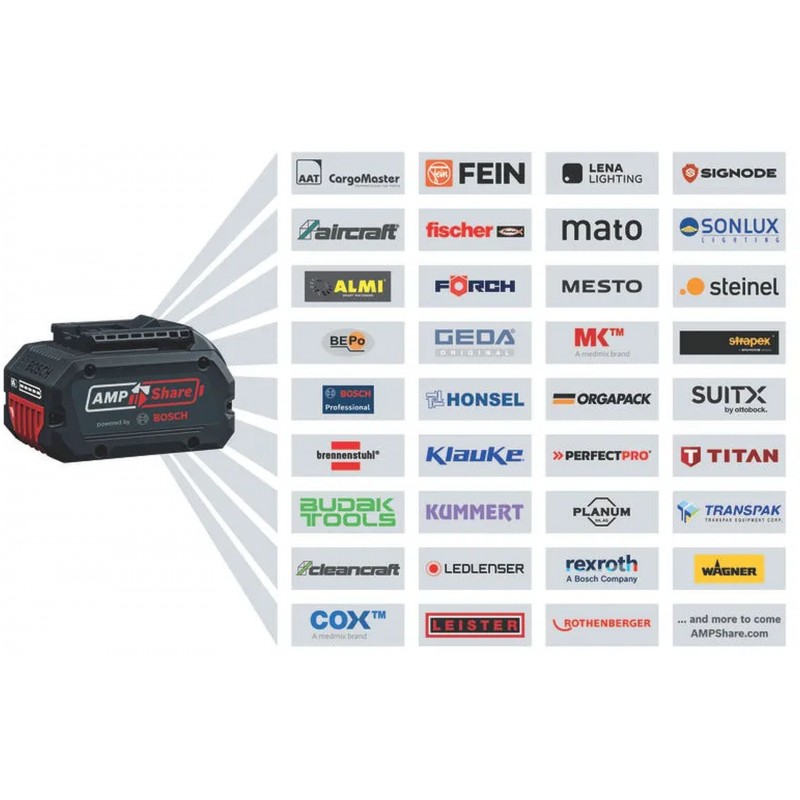 Kompatibel mit dem Bosch Professional 18V System und mit der markenübergreifenden AMPShare Akku-Allianz.