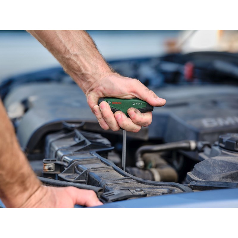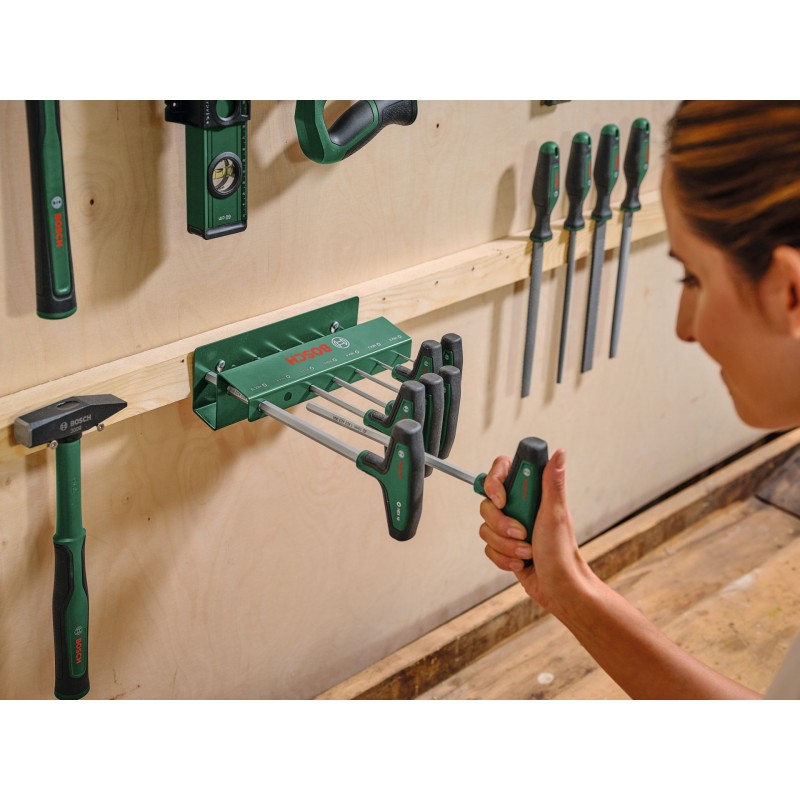 Das 7-teilige Sechskantschraubendreher-Set mit T-Griff von Bosch bietet mehr Komfort und Flexibilität für Aufgaben im Haushalt und beim Heimwerken. Alle Sechskantschraubendreher mit T-Griff (HEX2, HEX3, HEX4, HEX5, HEX6, HEX8, HEX10) sind eine Klasse für sich für kontrolliertes und kraftvolles Schrauben, auch an schwer zugänglichen Stellen, bei der Montage von Möbeln oder der Wartung von Motorrädern und Autos. Die ergonomischen Zweikomponenten-T-Griffe mit großen Softgrip-Flächen sind für Komfort und effiziente Kraftübertragung beim Schrauben ausgelegt, auch wenn ein hohes Drehmoment erforderlich ist. Jeder Schraubendreher mit T-Griff verfügt über einen erstklassigen Schaft aus S2-Stahl (56–60 HRC). Die extralangen Schäfte erleichtern das präzise Arbeiten an engen, schwer zugänglichen Stellen. Dank der intuitiven Größenangaben am Griff ist es einfach, den richtigen Schraubendreher für jede Aufgabe auszuwählen. Die gut organisierten Schraubendreher mit T-Griff werden in einem Metallgestell geliefert, das aufgestellt oder an der Wand montiert werden kann.