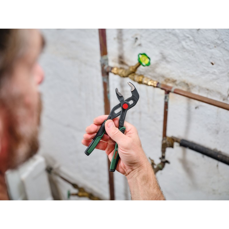 Die Bosch Wasserpumpenzange 180 mm ist die robuste Wahl für Klempnerarbeiten und zum Klemmen. Diese vielseitige Zange verfügt über 19 Einstellmöglichkeiten zum Greifen einer Reihe von Rohrgrößen. Sie lässt sich per Druckknopf fein bis zur maximalen Backenöffnung von 40 mm einstellen. Dank ihrer kompakten Bauweise, des geringen Gewichts und der schlanken, ergonomischen weichen Griffe bietet sie eine stabile Leistung und eine einfache Handhabung – auch an engen Stellen. Diese Zange ist aus robustem, hartem Kohlenstoffstahl (60 ± 2 HRC) mit schwarzem Phosphat-Finish gefertigt, was sie robust und langlebig macht. Die Zange entspricht den Normen ISO 8976 und ISO 5743.