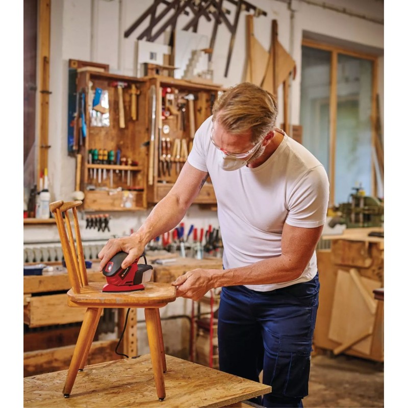 Der Multischleifer TE-OS 1320 ist ein handlicher Alleskönner, der höchste Ergonomie mit maximaler Funktionalität verbindet, um Oberflächen einen guten Schliff zu verpassen. Experten schätzen das einhändig geführte Gerät als unverzichtbaren Helfer beim Schleifen von Holz, Kunststoff und Metall, der seine Qualitäten besonders an schwer zugänglichen und kleineren Flächen voll ausspielt. Dank seines ergonomischen Designs mit Softgriff liegt es hervorragend in der Hand und lässt sich präzise führen. Der TE-OS 1320 ist mit einem Klettsystem ausgestattet, mit dem sich Schleifpapiere in Sekundenschnelle wechseln lassen und faltenfrei an der Schleifplatte anliegen. Sauberes, nahezu staubfreies Arbeiten ermöglicht die Staubfangbox mit integriertem Filter - so bleibt die Luft rein und das Schleifpapier scharf. Nach vollbrachter Arbeit lässt sich das aufgewickelte Kabel per Kabelclip fixieren, sodass der Multischleifer im Handumdrehen ordentlich verstaut ist. Damit die Arbeit sofort beginnen kann, sind drei Schleifpapiere P120 im Lieferumfang enthalten.