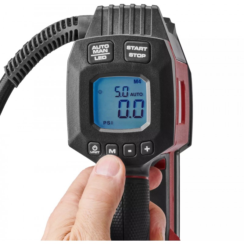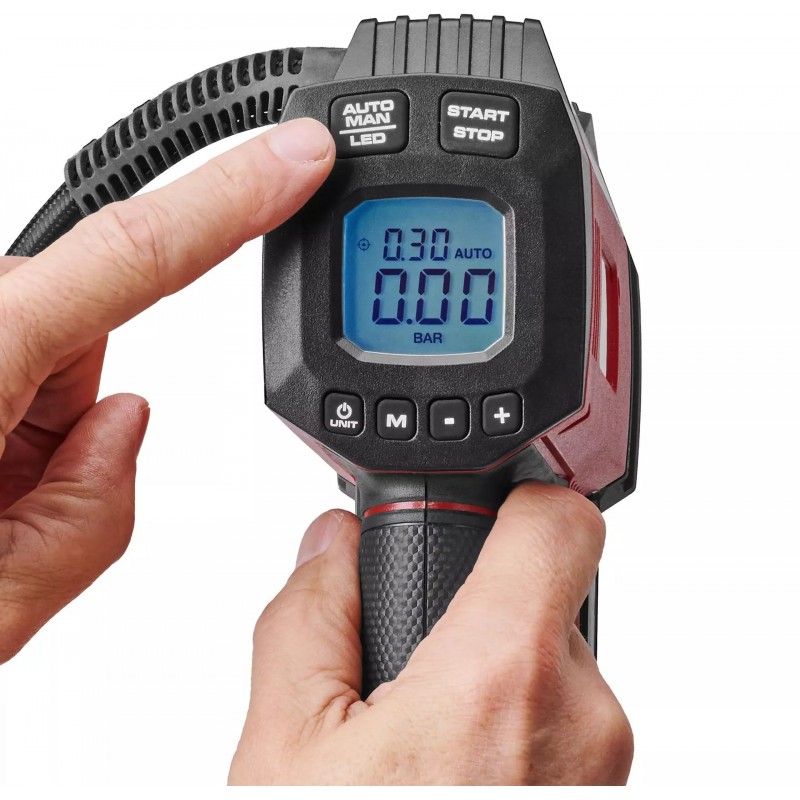 Über das helle LCD-Display kann der gewünschte Druck bis zu 11 bar voreingestellt werden. Der Kompressor pumpt dann Reifen oder Luftmatratzen automatisch auf. Mithilfe der manuellen Funktion kann auch händisch per Knopfdruck Luft aufgepumpt werden.