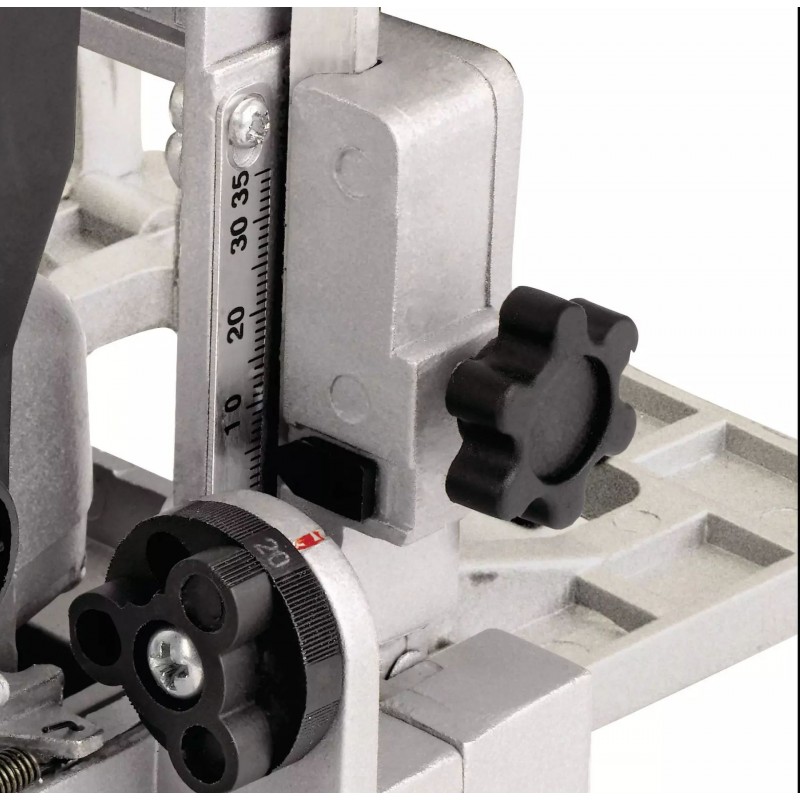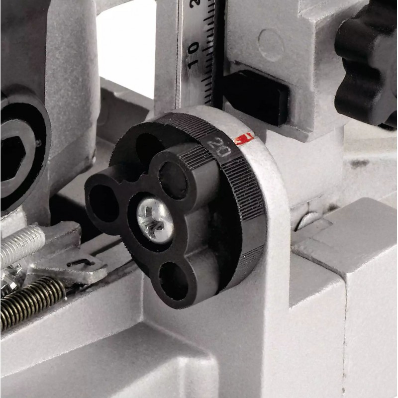 Mit der 3-stufigen Tiefenverstellung lassen sich Frästiefen bis 14 mm zur Herstellung vielfältiger Holzverbindungen einstellen.