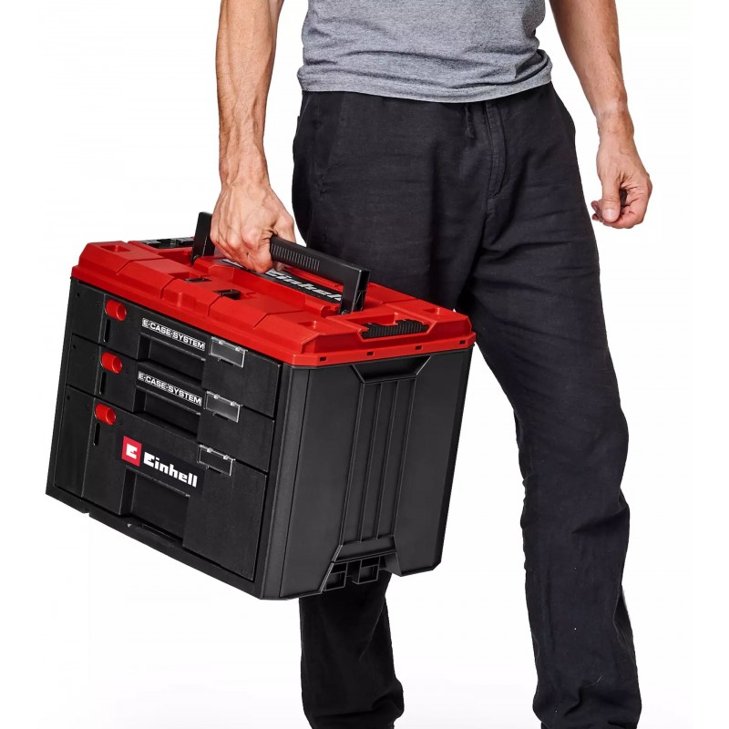 Der Einhell E-Case Schubladenkoffer ist Teil des modularen E-Case-Systems und sorgt für optimale Ordnung und Übersicht bei jedem Einsatz. Der robuste Systemkoffer lässt sich dank seines durchdachten Verriegelungssystems sicher stapeln und sogar mit Half Size E-Cases kombinieren. Er verfügt über drei stabile Schubladen: Zwei kleinere (je 5,5 cm hoch) eignen sich perfekt für Schrauben, Dübel oder andere Kleinteile, während die große untere Schublade (12,5 cm hoch) auch Platz für Elektrowerkzeuge wie Akkuschrauber oder Winkelschleifer bietet. Jede Schublade kann dabei ein Gewicht von bis zu 20 kg tragen. Insgesamt kann der Koffer mit einem Gewicht von max. 1.000 kg belastet werden. Besonders durchdacht ist der schnelle und einfache Zugriff auf den Inhalt: Auch im gestapelten Zustand lassen sich die Schubladen komfortabel öffnen. Für maximale Sicherheit sind alle Schubladen mit Verriegelungsschiebern ausgestattet, zudem ist eine Vorrichtung für ein Vorhängeschloss integriert – ideal für den sicheren Transport und perfekt als Diebstahlsicherung. Zum Lieferumfang gehören 12 praktische Sortierboxen mit Deckel für die kleinen Schubladen sowie ein Abtrenner-Set für die große Schublade. Transparente Sichtfenster ermöglichen die einfache Beschriftung der Schubladen. Der große, ergonomisch geformte Tragegriff sorgt für komfortablen Transport auch bei voller Beladung von max. 60 kg.