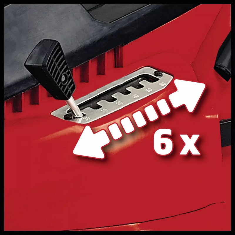 Der Griff lässt sich ergonomisch an jeden Nutzer anpassen. Dank der 6-stufigen zentralen Schnitthöhenverstellung kann die gewünschte Rasenhöhe schnell und individuell zwischen 20–65 mm eingestellt werden. Speziell entwickelte Hinterräder schonen den Rasen durch ihre breite Auflagefläche und erleichtern die Arbeit auf unebenem Gelände.