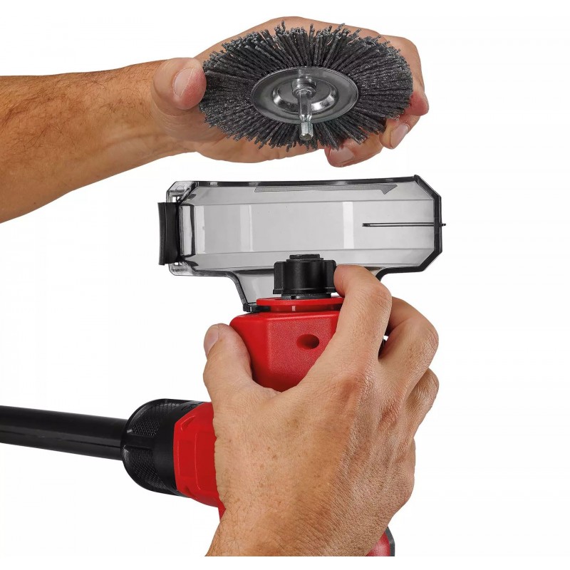 Der Akku-Fugenreiniger verfügt über eine transparente Spritzschutzhaube mit gut sichtbarer Führungslinie, die eine optimale Sicht auf die Fugen ermöglicht. Die Haube schützt während der Arbeit effektiv vor Staub und Schmutz und ist im Winkel verstellbar.