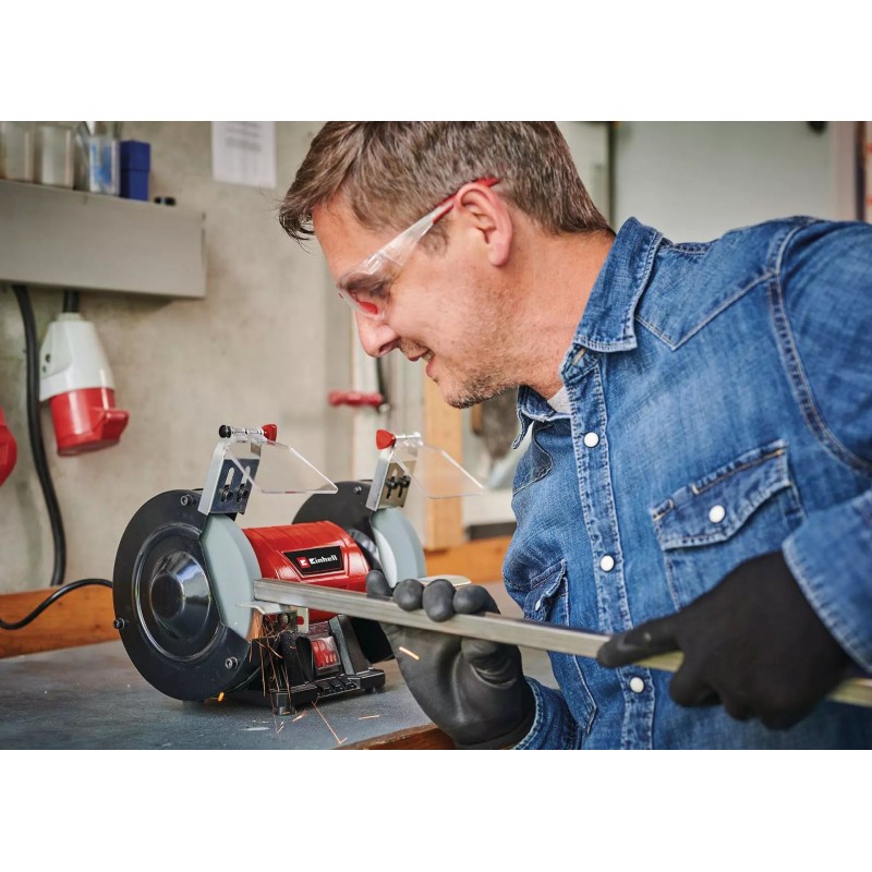Der Einhell Doppelschleifer TC-BG 150 ist eine praktische Schleifmaschine, die vielseitig zum Einsatz kommt. Ein Doppelschleifer mit zwei Schleifscheiben, die jeweils von einem Motor angetrieben werden, gehört zur Grundausstattung einer Werkstatt. Mit einem Doppelschleifer können Scheren, Messer und Klingen, Schneideblätter, Bohrer und Fräser, sogar Meißel geschärft werden. Darüber hinaus kann der Doppelschleifer zum Entrosten und Entgraten, zum Schleifen und Polieren von verschiedenen Werkstücken aus Holz, Kunststoff und Metall genutzt werden. Der Doppelschleifer ist speziell geeignet für leichte Formkorrekturen und das Nachschärfen von Schneiden, aber auch für starke Formkorrekturen sowie neue Anschliffe. Die robuste Metallkompaktbauweise gewährt die lange Lebensdauer des Schleifers. Große, verstellbare Arbeitsauflagen unterstützen auf den unterschiedlichen Anwendungsgebieten, präzise Ergebnisse werden durch die spielfreien, kugelgelagerten Wellen ermöglicht. Sicherheit gewährleisten die werkzeuglos einstellbaren Funkenschutzgläser und die seitlich geschlossenen Schutzhauben. Vier Gummifüße dämpfen Vibrationen und sorgen im Einsatz für einen sicheren, festen Stand. In der Lieferung inklusive ist eine Grob- und Feinschleifscheibe (K36/K60).