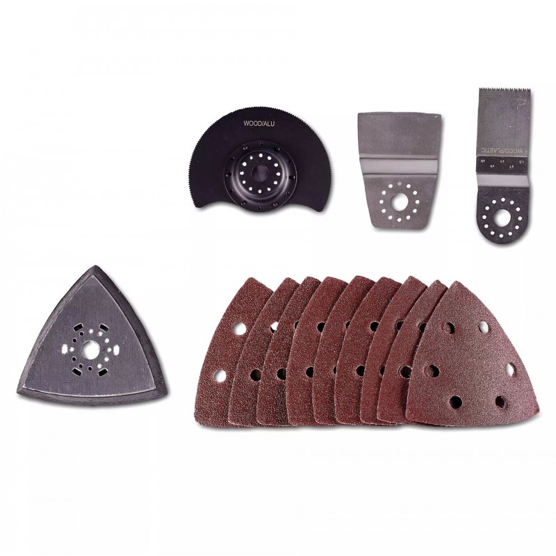 Inkl. Dreiecksschleifplatte, 9x Schleifpapier, Schaber, Tauchsägeblatt für Holz und Kunststoff und ein Segmentsägeblatt für Weichmetall.