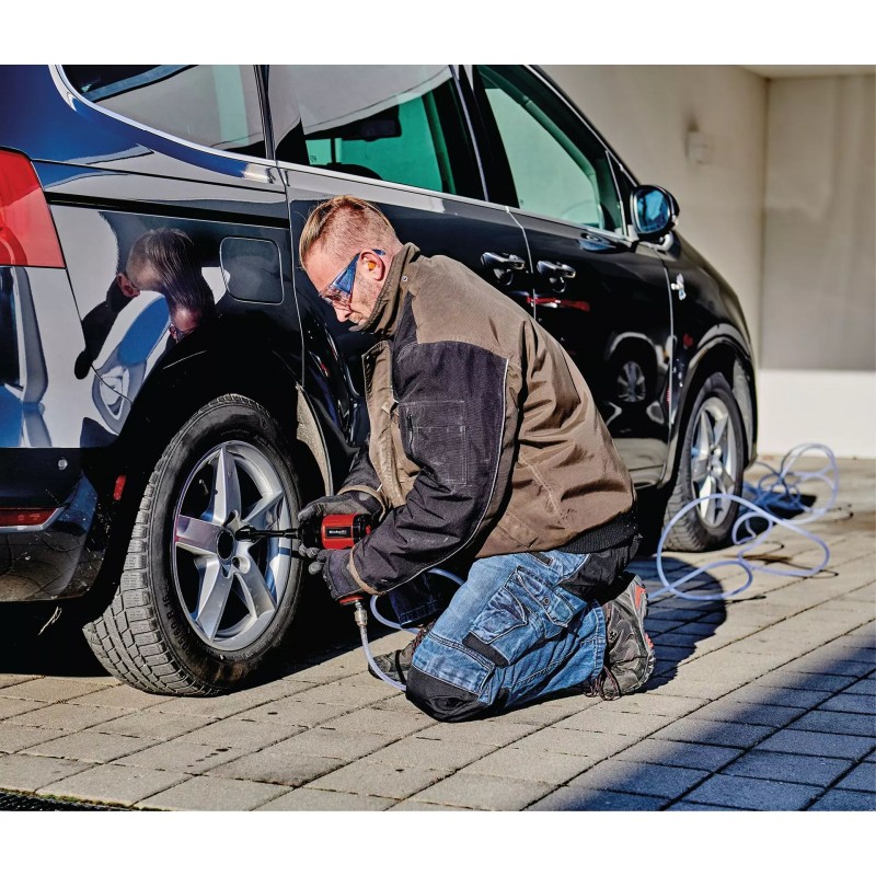 Der Einhell Druckluft-Schlagschrauber TC-PW 610 nimmt sich der Arbeiten in Heim, Werkstatt und Garage kraftvoll an. Dank seiner hohen Leistung ist er auch für anspruchsvolle Aufgaben bestens geeignet. Beste Performance bietet er dabei ab einem Schlauchinnendurchmesser von 9 mm. Der maximale Arbeitsdruck beträgt 6,3 bar, die Gewindegröße 19 mm.