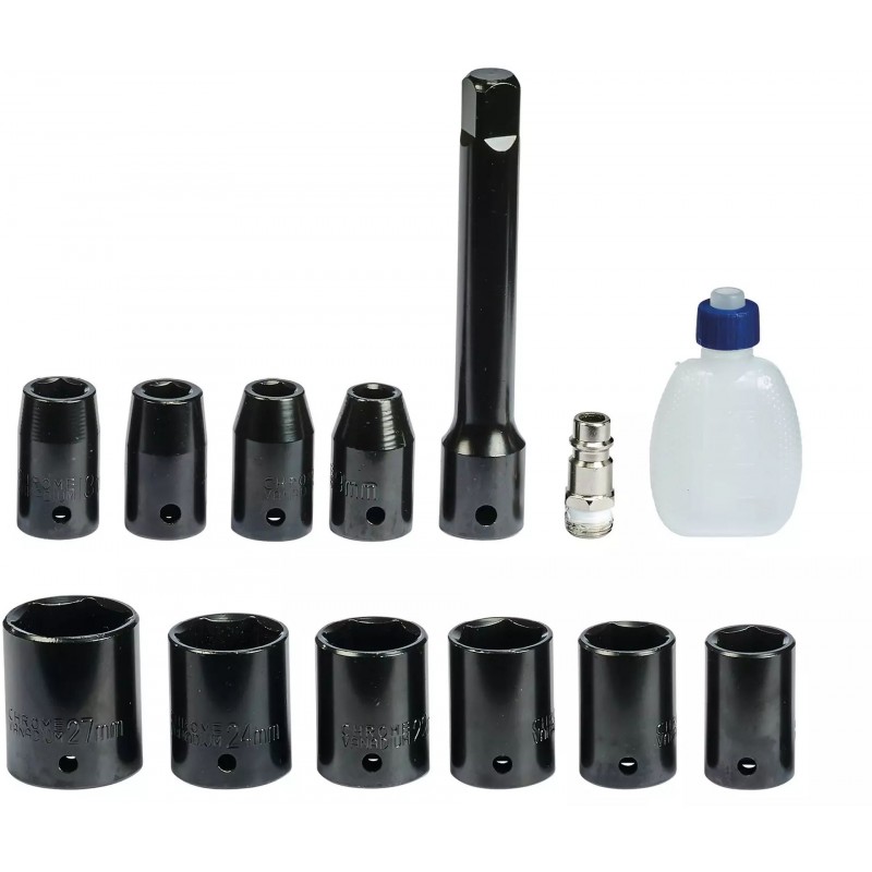 Der Schrauber wird inkl. 10 Stecknüssen (8/10/11/13/17/19/21/22/24/27 mm), Ölfläschchen, Stecknippel und Verlängerung geliefert.