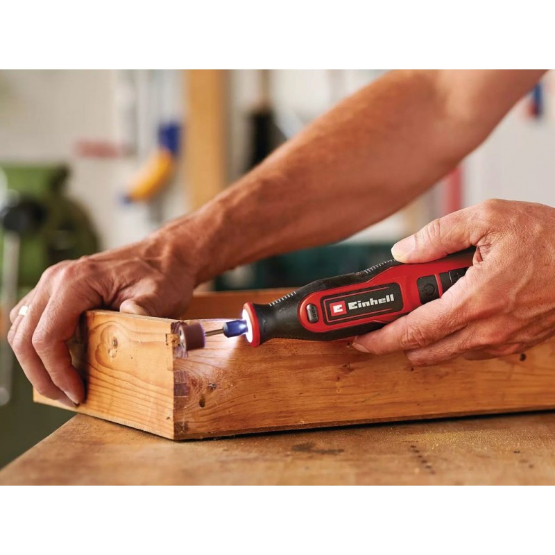 Das Einhell Akku-Schleif- und Gravur-Werkzeug TE-MT 7,2 Li ist ein universeller Helfer bei zahlreichen Arbeitsanforderungen beim Gravieren, Fräsen, Schleifen und Bürsten, ob bei handwerklichen Aufgaben in Heim, Werkstatt oder Garage. Von einem ausdauernden Akku (7.2 V | 1.500 mAh) betrieben, sorgt die Drehzahlelektronik mit einer LED-Anzeige in jeder Situation für materialgerechte Anwendungen – und das bei Drehzahlen von 5.500 bis 26.000 Umdrehungen pro Minute. Der Arretierknopf erlaubt einen einfachen Werkzeugwechsel. Ausgestattet mit einem LED-Leuchtring, kann der Anwender das zu bearbeitende Werkstück optimal beleuchten und besser bearbeiten. Dabei sorgt der ergonomische Softgrip für einen sicheren Halt und damit optimale Präzision. Ob Schleifen oder Gravieren, das Gerät ist stets einsatzbereit dank der mitgelieferten Ladestation. Zum Lieferumfang gehört aber auch ein umfangreiches, 57-teiliges Zubehörset in einer praktischen Aufbewahrungsbox, womit universellen Einsätzen aller Art kaum Grenzen gesetzt sind.
