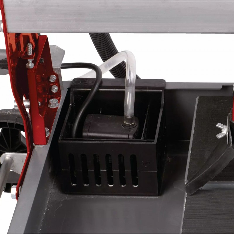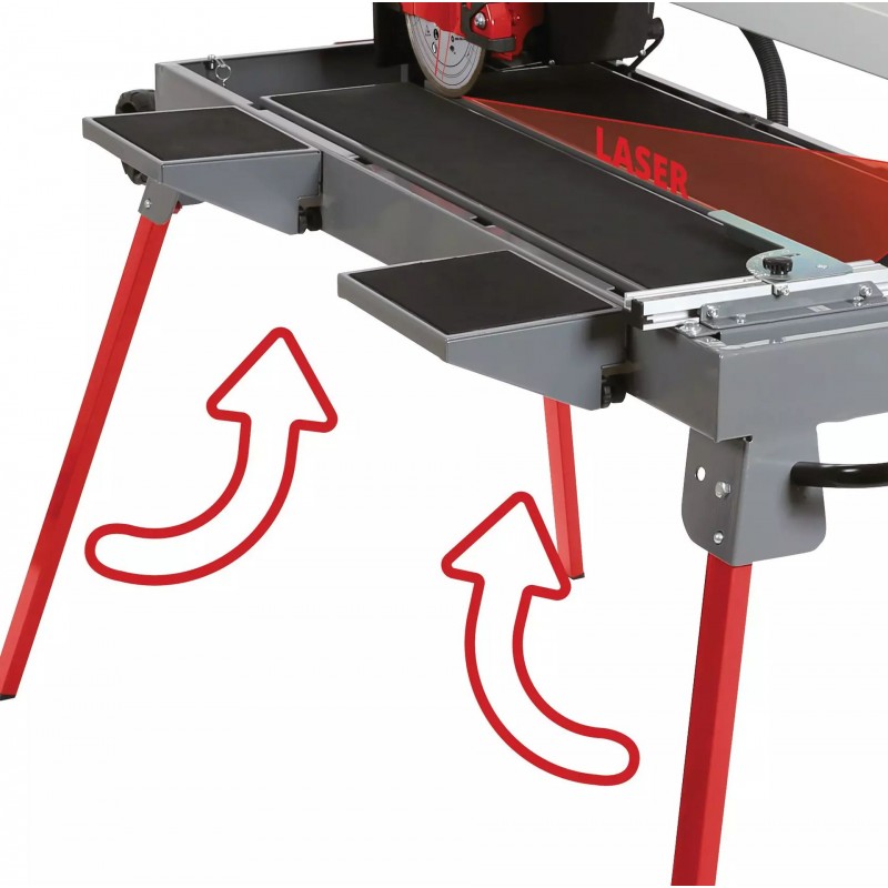 Die Radial-Fliesenschneidmaschine von Einhell verfügt über extra lange Schnittlängen für moderne Großformate. Ein Laser dient der optischen Schnitthilfe. Die sechsfach kugelgelagerte Motorführung bietet einen gleichmäßigen Schnitt. Für eine exakte Kantenführung sorgt der gradgenau einstellbare Winkelanschlag als stabile Führung für Gehrungs- und auch Doppelgehrungsschnitte. Der Motor ist bis zu 45° Grad schwenkbar und bereits mit einer Turbo-Diamant Trennscheibe mit Wasserzuführung ausgerüstet. Die Wasserpumpe mit Schmutzfangkäfig und auswaschbaren Filtermatten hält größere Splitter und feste Verunreinigungen von der Pumpe fern. Zusätzlich werden feine Metallteilchen von der integrierten Filterung herausgelöst, so dass die Pumpe auch davon geschützt bleibt. Die massive Wasserauffangwanne ist aus Stahlblech gefertigt. Die Fliesenschneidemaschine ist auf einem robusten, einklappbaren Untergestell mit Einrastfunktion aufgebaut. Der höhenverstellbare Fuß lässt sich auf eine bequeme Arbeitshöhe anpassen. Der große Arbeitstisch mit rutschfester Gummiauflage allein bietet eine angemessene Arbeitsfläche für kleinere Projekte. Für größere Flächenbearbeitungen sind zudem zwei zusätzliche Arbeitische zur Verbreiterung des Arbeitstisches im Umfang. Die robusten Transporträder und der Transportgriff ermöglichen eine einfache Verschiebung des Schnittbereiches.