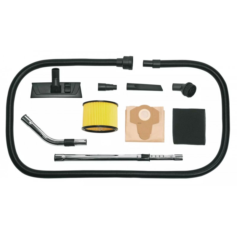Die Kombidüse ist geeignet für das Reinigen von Teppich- und Glattböden, die Polsterdüse erleichtert die Reinigung von Autositzen und Polstermöbeln und mit der Fugendüse erreicht man auch enge oder schwer zugängliche Stellen problemlos. Verstauen lässt sich das Zubehör in den praktischen Halterungen am Sauger. Das teleskopierbare Saugrohr lässt sich individuell an die eigene Körpergröße anpassen. Der Elektrowerkzeugadapter ist mit allen handelsüblichen Elektrowerkzeugen kompatibel.