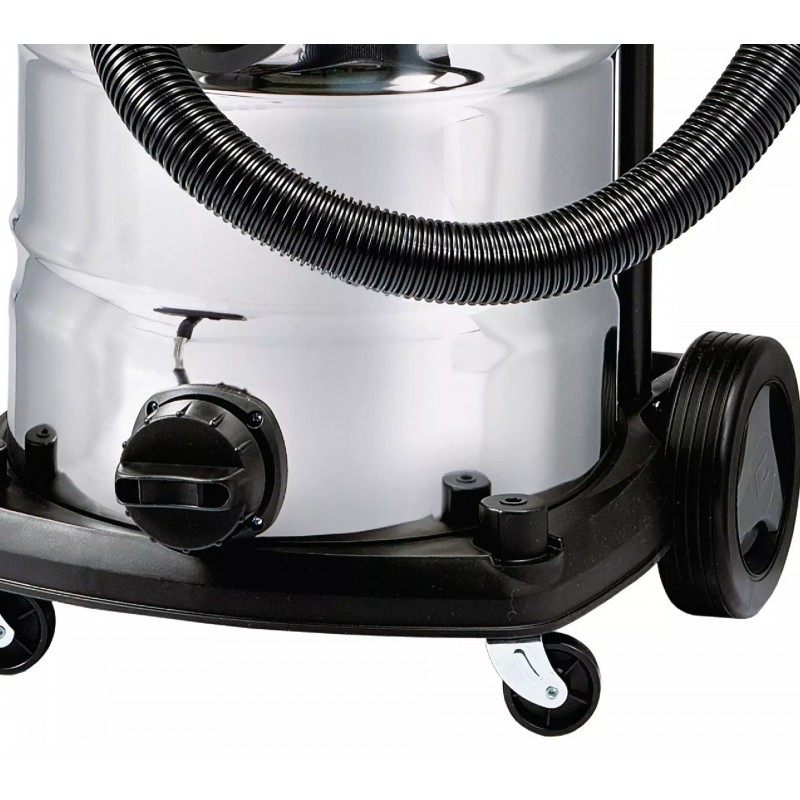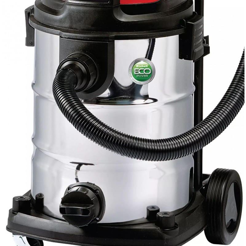 Der Einhell Nass-Trockensauger TE-VC 2230 SA reinigt im Gegensatz zu einem reinen Staubsauger und einem Wischmopp tief und gründlich. Damit ist ein Nass-Trockensauger die passende Ergänzung zu haushaltsüblichen Reinigungsgeräten bei starken, hartnäckigen und tiefen Verschmutzungen. Auch ambitionierten Heimwerkern ist ein Nass-Trockensauger bei Reinigungsaufgaben am Bau, in der Werkstatt oder im Hobbykeller ein praktischer Helfer. Das Innere aller Arten von Kraftfahrzeugen kann mit einem Nass-Trockensauger bis in die Textilspitzen gereinigt werden, Sitze und Himmel gleichermaßen wie die Teppiche und die Verkleidung. Der Einhell Nass-Trockensauger ist als ECO Staubsauger für hohe Saugleistung bei geringem Stromverbrauch konzipiert und setzt 1.150 Watt um. Der rostfreie Edelstahlbehälter fasst 30 Liter und ermöglicht damit ausdauernde Einsätze. Der Fehlluftregler ist einfach zu erreichen am Handgriff. Ein Blasanschluss zum Ausblasen von schwer zugänglichen Stellen ist integriert. Große Räder und Rollen gewähren einen einfachen Transport und Mobilität. Am Gehäuse integriert ist eine automatische Gerätesteckdose zum Betrieb von Elektrowerkzeugen. Ebenso vorhanden ist eine praktische Zubehörhalterung zum sauberen Verstauen des mitgelieferten Zubehörs. Das 500 Zentimeter lange Stromkabel kann am Trolley-Griff aufgewickelt werden. Eine einfache Reinigung des Nass-Trockensaugers gelingt durch die Wasserablassschraube zum Ablassen des aufgesaugten Wassers. Im Lieferumfang enthalten sind ein Teleskoprohr aus Edelstahl (O 36 mm), ein extra langer Plastiksaugschlauch (O 36 mm) mit 3 Metern Länge, eine große Kombidüse für Teppich- und Glattböden, Fugen- und Polsterdüse sowie Schaumstofffilter, Faltenfilter und Papierschmutzfangsack.