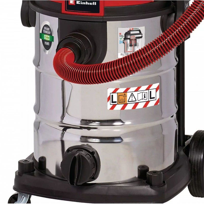 Egal ob Staub, Flüssigkeit oder Schmutz, zuhause oder auf der Baustelle, der 1.400 Watt starke Einhell Nass-Trockensauger TE-VC 2230 SACL reinigt alle Flächen porentief rein. Ausgestattet mit einer Kombi-Düse für Teppich- und Glattböden, einer Polsterdüse für Autositze und andere Polstermöbel, sowie einer Fugendüse für schwer zugängliche Ecken, nimmt es der Sauger mit jeder Hürde auf. Enge Nischen kann man durch die Blasfunktion kurzerhand ausblasen, um den Schmutz dann aufzusaugen. Im Lieferumfang sind außerdem ein Schaumstofffilter zum Nassaugen und ein effizienter HEPA-Filter, ebenso wie ein langlebiger, reißfester Vliesbeutel zum Trockensaugen enthalten. Der HEPA-Filter filtert selbst kleinste Partikel aus der Luft und ist besonders für Allergiker geeignet. Außerdem erfüllt der Nass-Trockensauger die Staubschutzklasse L nach Euronorm und darf somit zum Trockensaugen von gesundheitsgefährdendem Staub wie Gipsstaub, Kalk und Glimmer eingesetzt werden. Damit ist der Sauger auch optimal für den Einsatz auf Baustellen geeignet. Durch die stufenlos einstellbare Geschwindigkeitsregelung lässt sich die Saugleistung von bis zu 220 mbar auch an sensible Arbeitsbereiche individuell anpassen. Ein innovatives Filterreinigungssystem reinigt auf Knopfdruck den Filter nach längerem Betrieb oder starker Staubbelastung und stellt die maximale Saugleistung wieder her. An die automatische Gerätesteckdose (max. Leistung 2.000 Watt) lassen sich Elektrogeräte wie Mauernutfräsen oder Trockenbauschleifer praktischerweise anschließen, wodurch sich bei Ein- und Ausschalten des angeschlossenen Werkzeugs gleichzeitig auch der Sauger an- und ausschaltet. So dient der Nass-Trockensauger gleichzeitig zur sauberen Absaugung und Stromversorgung - und das extrem komfortabel. Der rostfreie und stabile Edelstahlbehälter kann Schmutz und Flüssigkeiten bis zu 30 Liter fassen und durch die integrierte Wasserablassschraube wird das aufgesaugte Wasser kinderleicht entleert. Dank Räder, Rollen und Trolley-Griff lässt sich der Nass-Trockensauger ohne Kraftaufwand zum Einsatzort transportieren. Der 3 Meter lange, robuste Plastiksaugschlauch mit einem 36 Millimeter Durchmesser und das 5 Meter lange Kabel ergeben einen Einsatzradius von 8 Metern, so lässt sich der Sauger auch für Einsätze über Kopf verwenden. Durch die Zubehörhalterung, Kabelhalterung und Saugrohrhalterung für das Edelstahl-Teleskoprohr mit Fehlluftregler sind Sauger und Zubehör nicht nur schnell und sauber verstaut, sondern genauso schnell wieder einsatzbereit.