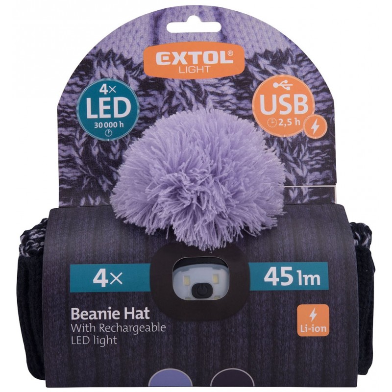 - Pro odeslání do Česka navštivte EXTOL LIGHT čepice s čelovkou 4x45lm, USB nabíjení, tmavě modrá/fialová s bambulí 43466