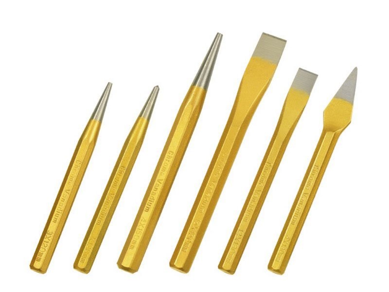 Zusammensetzung des Sets: 2x Flachmeißel 11x130mm, 15x150mm DIN6453, Kreuzmeißel 4x130mm DIN6451, 2x Locher 3x120, 4x150mm DIN6458, Körner 4x120mm DIN7250, im Nylonetui * CrV * DIN6453, DIN6451, DIN6458, DIN7250