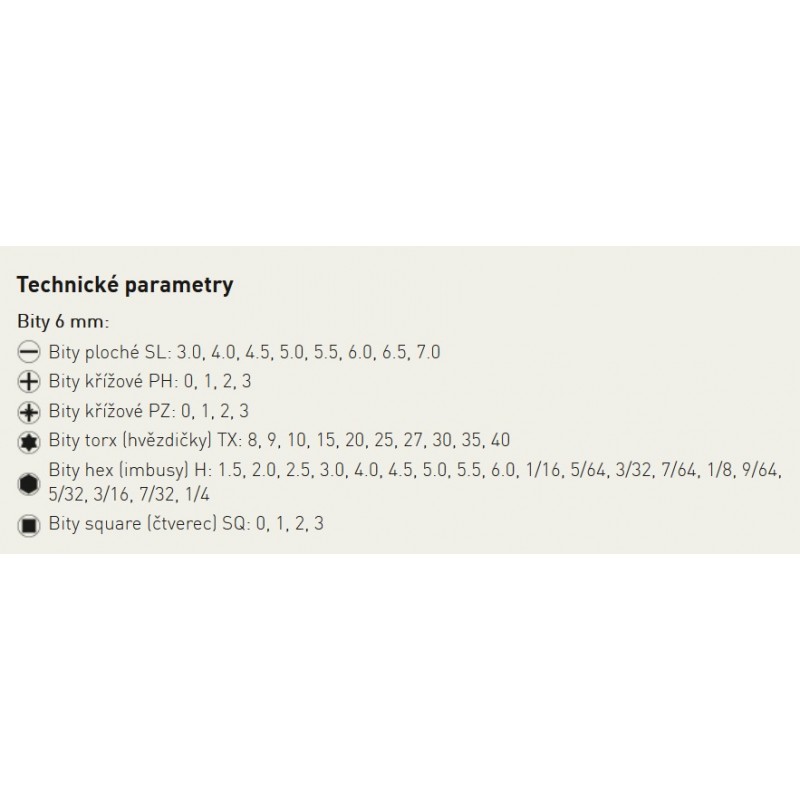 • Hex-Bits (hex) H: 1,5, 2,0, 2,5, 3,0, 4,0, 4,5, 5,0, 5,5, 6,0, 1/16, 5/64, 3/32, 7/64, 1/8, 9/64, 32.5., 16.3., 32.7., 4.1