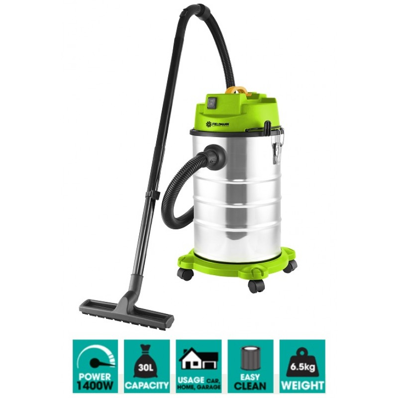 Der vierhundert Watt starke Nass-/Trockensauger ist mit einem Baumwollfilter aus Vollfasern ausgestattet, der selbst feinsten Schmutz auffängt. Der Baumwollfilter ist intuitiv abnehmbar, es wird kein Werkzeug benötigt. Lösen Sie einfach die beiden Schnallen und entfernen Sie den Motor. Der verchromte 30-Liter-Behälter mit Untergestell mit Rädern fasst eine ausreichende Menge Sauggut inklusive Wasser. Der Staubsauger ist mit einem Kunststoffschlauch mit Zubehör ausgestattet, das eine komfortable Reinigung des Hofes, der Garage, der Werkstatt oder des Autos garantiert.