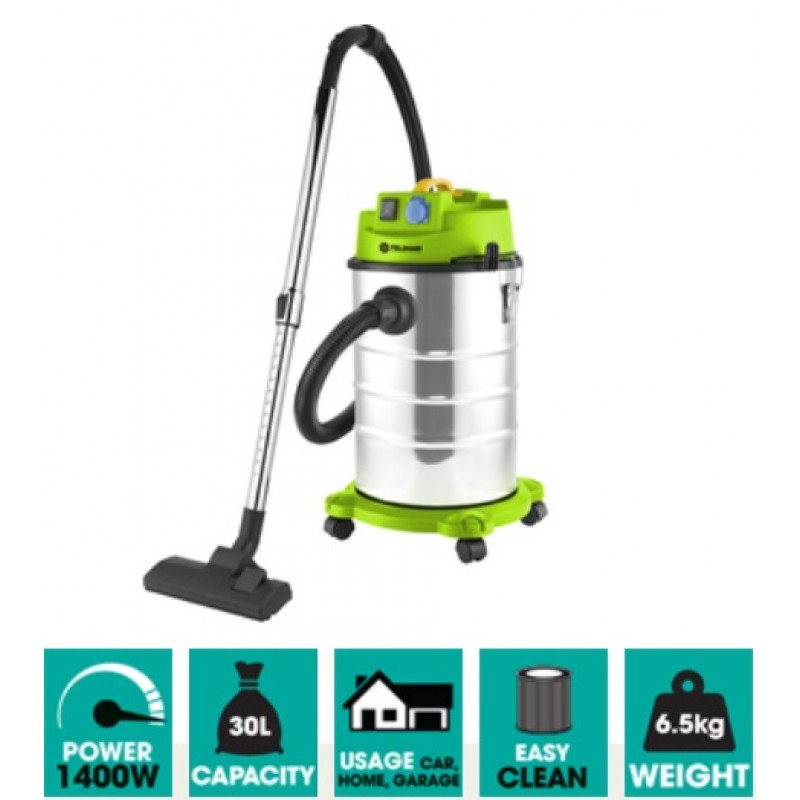 Der vierhundert Watt starke Nass-/Trockensauger ist mit einem Baumwollfilter aus Vollfasern ausgestattet, der selbst feinsten Schmutz auffängt. Der Baumwollfilter ist intuitiv abnehmbar, es wird kein Werkzeug benötigt. Lösen Sie einfach die beiden Schnallen und entfernen Sie den Motor. Der verchromte 30-Liter-Behälter mit Untergestell mit Rädern fasst eine ausreichende Menge Sauggut inklusive Wasser. Der Staubsauger ist mit einem zweieinhalb Meter langen Kunststoffschlauch mit Zubehör ausgestattet, das eine bequeme Reichweite beim Reinigen von Hof, Garage, Werkstatt oder Auto garantiert. Die Steckdose kann bei Arbeiten in der Werkstatt zum Anschluss von beispielsweise diversen Schleifmaschinen oder Sägen, aber auch zum Anschluss von Hochdruckspülmaschinen zum Reinigen von Pflaster- und Terrassenflächen im Außenbereich genutzt werden. Der Vorteil dieser Steckdose ist das Einschalten des Staubsaugers im Moment des Einschaltens des angeschlossenen Geräts, wodurch die Sorge um zwei Schalter entfällt.