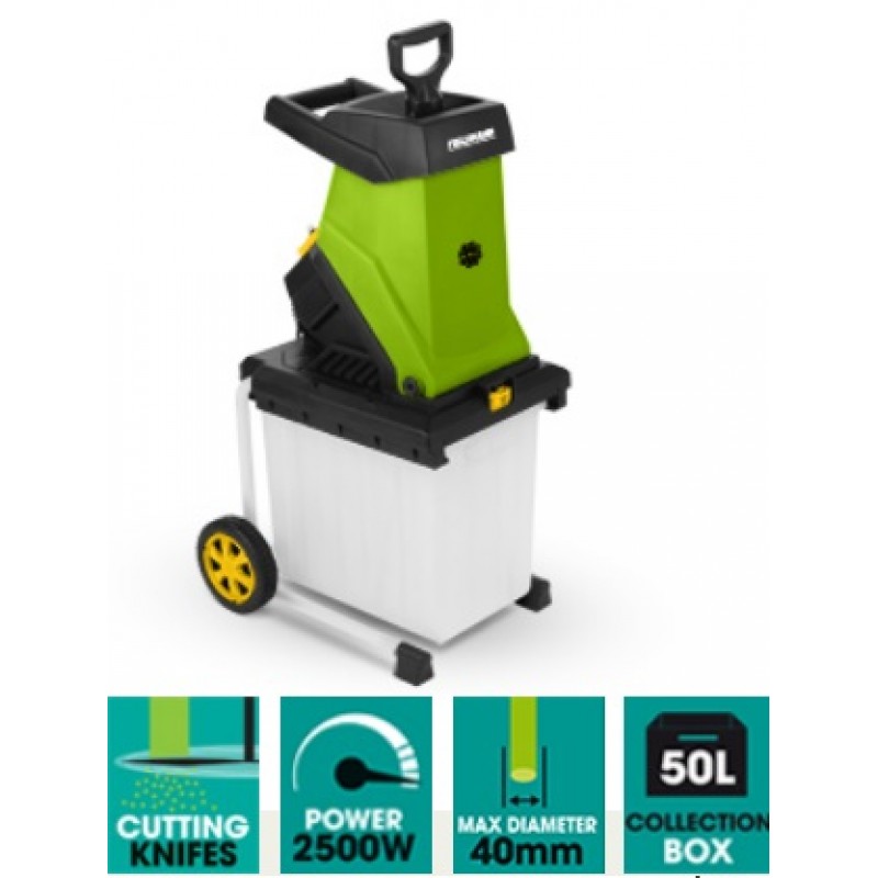 Der Elektrobrecher mit einer Leistungsaufnahme von 2.500 W ist mit einer Thermosicherung ausgestattet, die eine Überlastung und anschließende Zerstörung der Maschine verhindert. Integraler Bestandteil ist ein Kunststoffbehälter, der den Umgang mit Krümeln erheblich erleichtert. Mit diesem Modell können Sie Äste bis zu einem Durchmesser von 4 cm zerkleinern. Der Stahlrahmen erhöht die Stabilität während der Arbeit und hilft so beim sicheren Umgang mit der Maschine. Im Lieferumfang ist auch ein Stößel zum sicheren Transport von Materialresten zu den Messern enthalten.