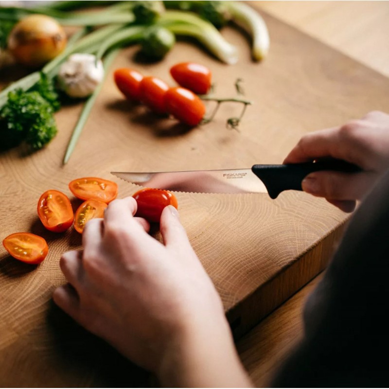 Fiskars Essential Frühstücksmesser mit Wellenschliff ist ein vielseitiges kleines Messer für den täglichen Gebrauch in der Küche. Mit einer Klingenlänge von 12 cm und dem Wellenschliff eignet es sich perfekt zum Schneiden von Lebensmitteln mit harter Kruste oder Schale, wie Tomaten, Baguette, Brot oder Steaks.