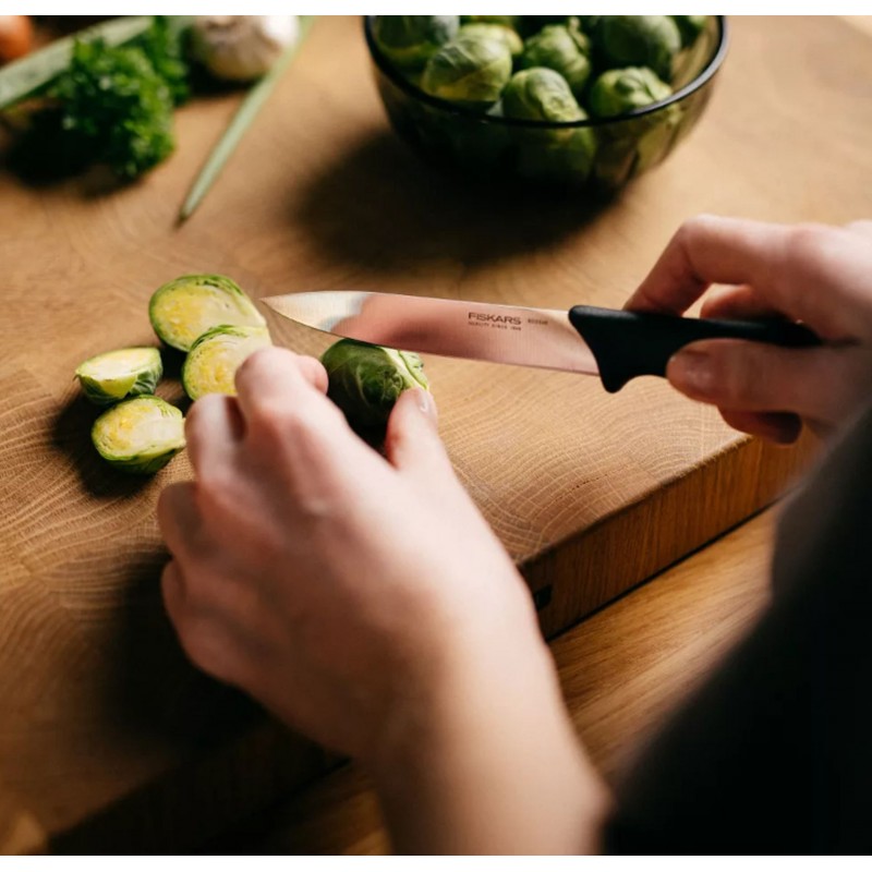 Für eine lange Lebensdauer empfehlen wir regelmäßiges Schärfen mit Wetzstahl oder Messerschärfer von Fiskars. Spülmaschinengeeignet.