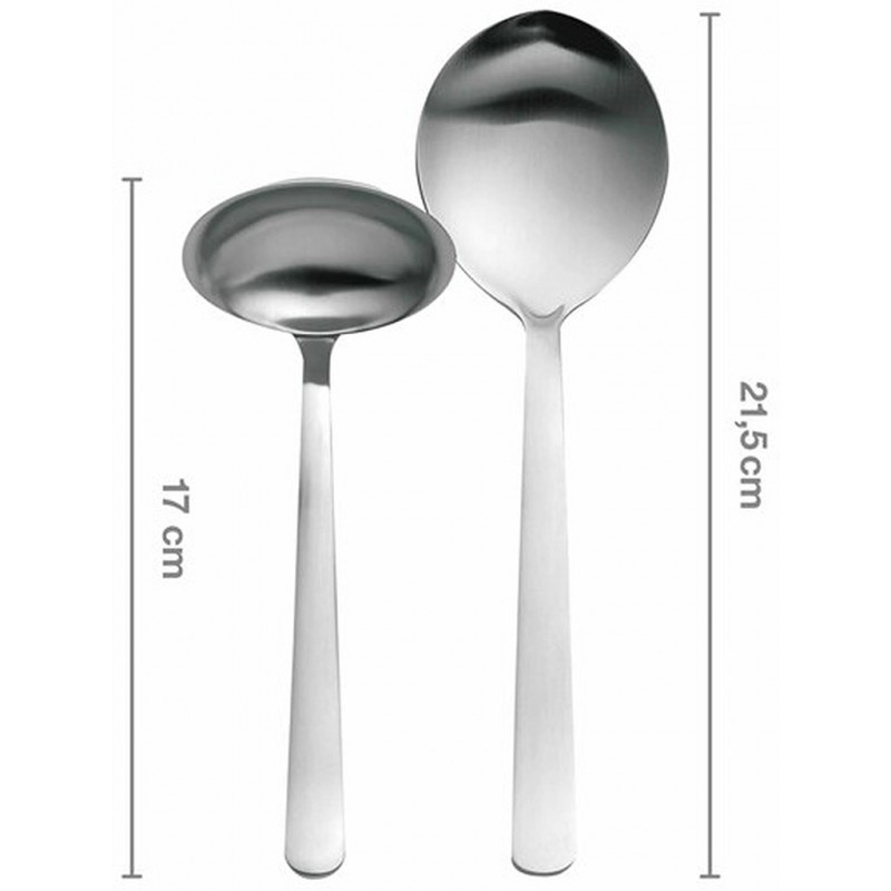Zeitlos, schlicht und praktisch präsentiert sich das Servierbesteck der Functional Form Serie von Fiskars. Zum 132 g schweren Servierset zählen ein Servierlöffel und eine Schöpfkelle in schlichter, moderner Formgebung. Die sich leicht verbreiternden Griffe gehen nahtlos in den Löffelkopf bzw. die eigentliche Kelle über. Groß und fast vollkommen rund präsentiert der Servierlöffel die Speisen bei Tisch auf stilvolle, elegante Art und erleichtert ihre Verteilung an jeden Gast. Die oval geformte Schöpfkelle passt hervorragend zu modernen Geschirren und schenkt Brühen und Soßen einfach und sicher aus. Aus rostfreiem Edelstahl gefertigt sind beide Teile sehr robust und pflegeleicht. Reinigen lassen sie sich einfach und schnell unter fließendem Wasser, mit Spülmittel oder in der Spülmaschine.