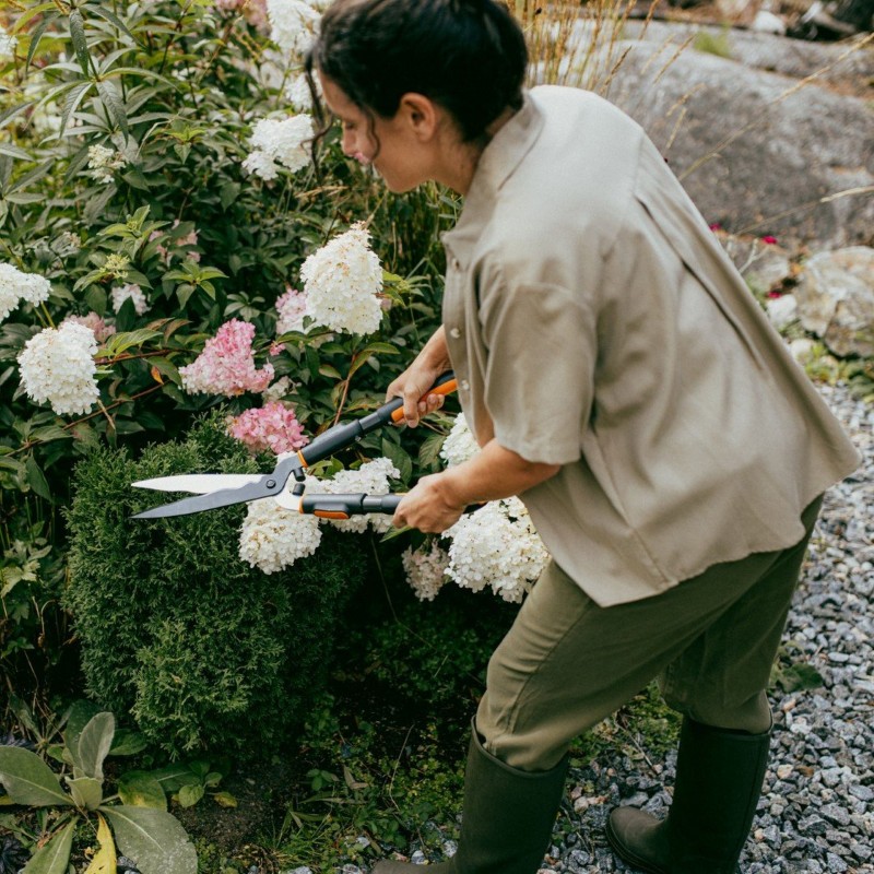 Die Fiskars OneClick Heckenschere mit Wellenschliff ist ideal zum Schneiden von Heckenzweigen und zum Erhalten ihrer Form. Die Klinge aus gehärtetem Stahl mit Oberflächenbeschichtung reduziert die Reibung und sorgt für einen sauberen und präzisen Schnitt.