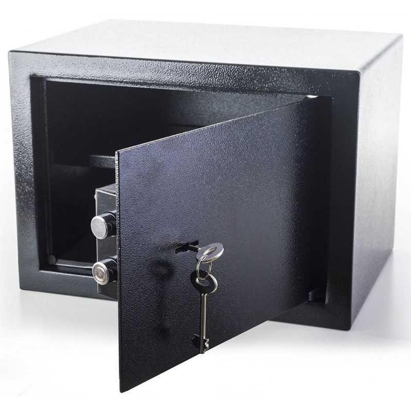 Der Safe besteht aus hochwertigem Feststoff. Die Wände des Safes bestehen aus 1,5 mm dickem Stahlblech, das Versuchen des erzwungenen Eindringens widersteht. Bei Türen ist das Stahlblech aus Sicherheitsgründen auf eine Dicke von 5 mm verstärkt. Darüber hinaus kann es aufgrund seines Gewichts von 8 kg niemand so leicht nehmen.