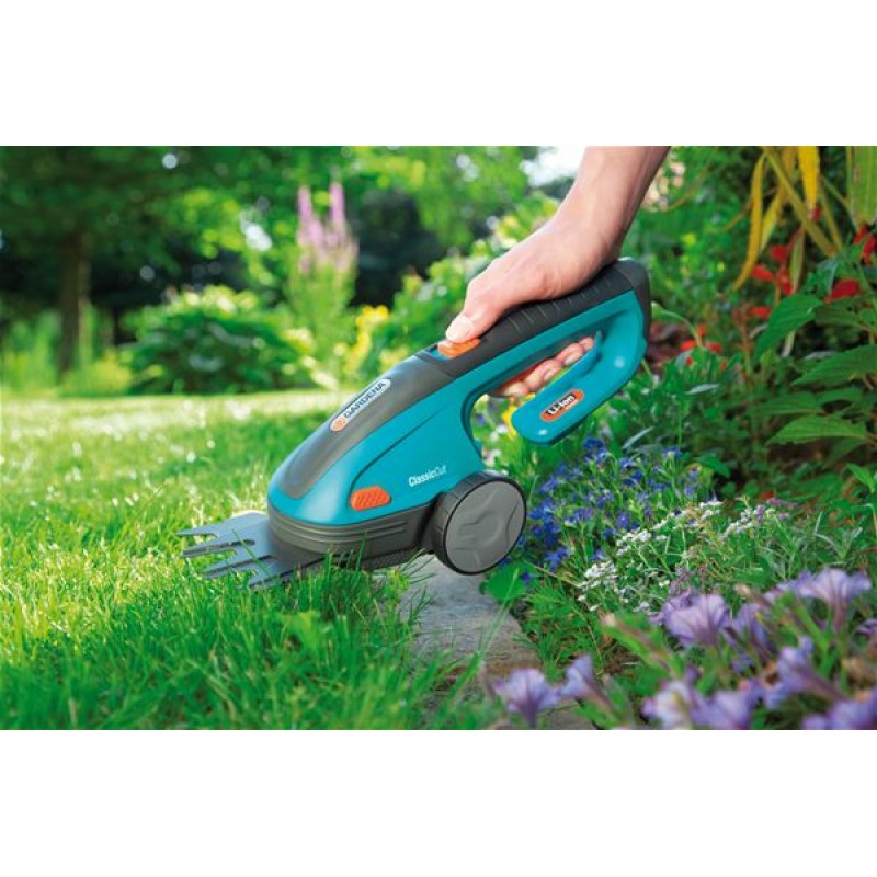 GARDENA Accu-Grasschere ComfortCutMit der GARDENA Accu-Grasschere ComfortCut können Sie Ihre Rasenkanten sehr komfortabel und kabellos schneiden. Ausgestattet mit dem Gras- und Buchsmesser mit 8 cm Breite eignet sich die Schere auch problemlos für den Formschnitt von Buchs. Bei dem Comfort-Modell legt GARDENA besonderen Wert auf eine angenehme Handhabung. So ist der Komfort-Handgriff je nach Anwendung abwinkelbar und passt sich optimal an die natürliche Handhaltung an. Integrierte Laufräder garantieren eine optimale Scherenführung und erleichtern den Rasenkantenschnitt deutlich. Dank der leistungsstarken, pflegeleichten Lithium-Ionen-Accuzellen ist ein kraftvolles und leichtes Arbeiten möglich. Die LED-Anzeige des Accu-Ladezustandes liefert dabei einen Überblick über die verbleibende Betriebsdauer und zeigt rechtzeitig an, wenn der Accu wieder aufgeladen werden sollte. Die auswechselbaren Qualitätsmesser sind präzise geschliffen und antihaftbeschichtet. Da der Messerwechsel ohne Werkzeug erfolgt, ist er besonders schnell, einfach und sicher durchgeführt. So ist die Grasschere im Nu durch den Tausch des Messers auch in eine Strauchschere umrüstbar. Die Accu-Grasschere beinhaltet ein Ladegerät sowie einen Messerschutz für eine sichere Aufbewahrung. Für ein komfortables Schneiden von Rasenkanten ohne Bücken ist die Schere mit einem Teleskopstiel nachrüstbar.