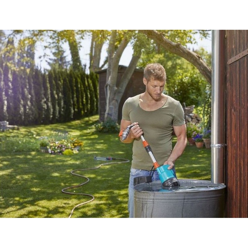 GARDENA Regenfasspumpe 2000/2 Li-18 Set 1749-20Mit der GARDENA Regenfasspumpe 2000/2 Li-18 lässt sich das kostenlose Regenwasser aus der Tonne nutzen, um den Garten mit GARDENA Spritzen, Brausen oder Regnern zu bewässern. Egal wo die Regentonne steht oder wo sich der nächste Stromanschluss befindet, dank Lithium-Ionen Akku ist die Pumpe absolut flexibel in der Handhabung. Die Pumpe ist auch zur Entwässerung geeignet. Akku und Ladegerät sind im Set enthalten. Angetrieben wird die Universal Regenfasspumpe von einem pflegeleichten GARDENA System Akku mit 18 V. Dieser lässt sich jederzeit ohne Memory-Effekt wieder aufladen.