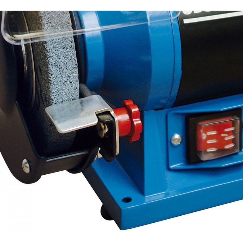 Stabiles Metallgehäuse, seitlich geschlossene Schutzhauben, verstellbare Arbeitsauflagen, großer einstellbarer Funkenschutz. Komplett mit Grob- und Feinschleifscheibe, Ein-/Ausschalter, Netzkabel mit Stecker und Adapter auf 12,7 mm.
