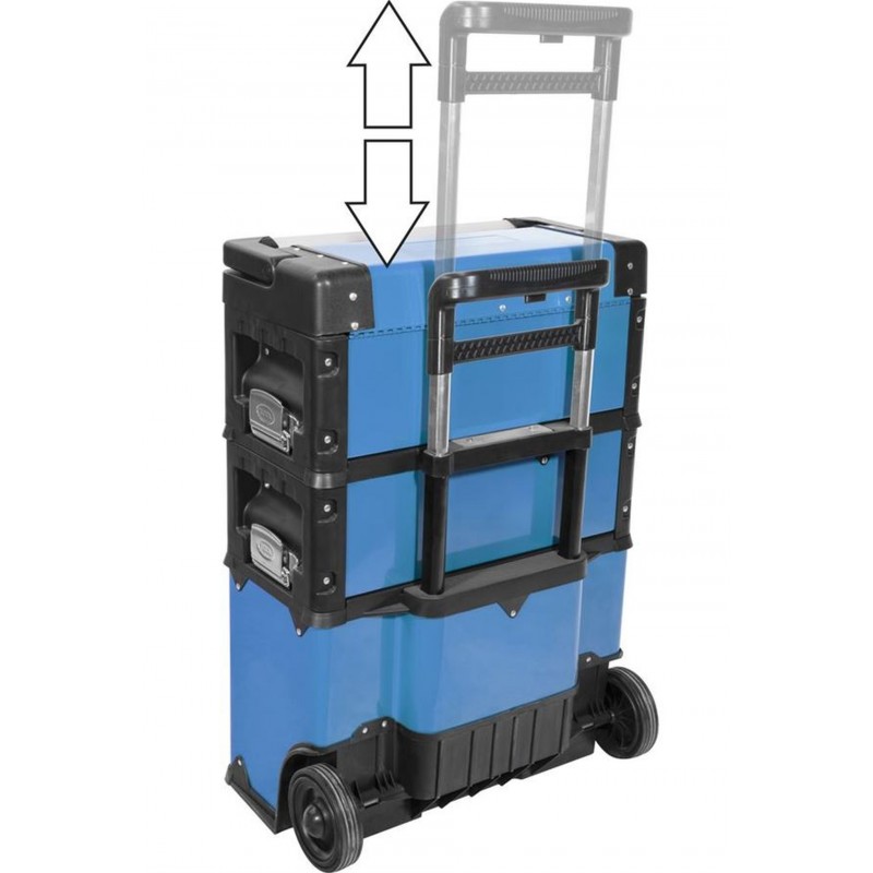 Der Werkzeugtrolley GWZT 2/1 besteht aus drei Hauptmodulen. Obenauf sitzt ein abnehmbarer Werkzeugkoffer, der einen herausnehmbaren Kleinteileeinsatz beinhaltet. Darunter folgt ein weiteres abnehmbares Modul mit zwei kugelgelagerten Schubladen, welches, wie der Koffer auch, über seitliche Tragemulden verfügt. Außerdem sind alle drei Module mit Tragegriffen und Vorrichtungen zur Anbringung von Vorhängeschlössern ausgestattet. Auf dem Rollengestänge befindet sich eine große Box mit breitem Kippfach, welches sich optimal zur Aufbewahrung von größerem Werkzeug eignet. Dank Teleskopgriff und zwei großen Hartgummi-Rollen ist der Trolley auch vollgepackt einfach zu bewegen und wird so zum idealen Begleiter für Heim- und Handwerker, Angler oder Bastel-Künstler.