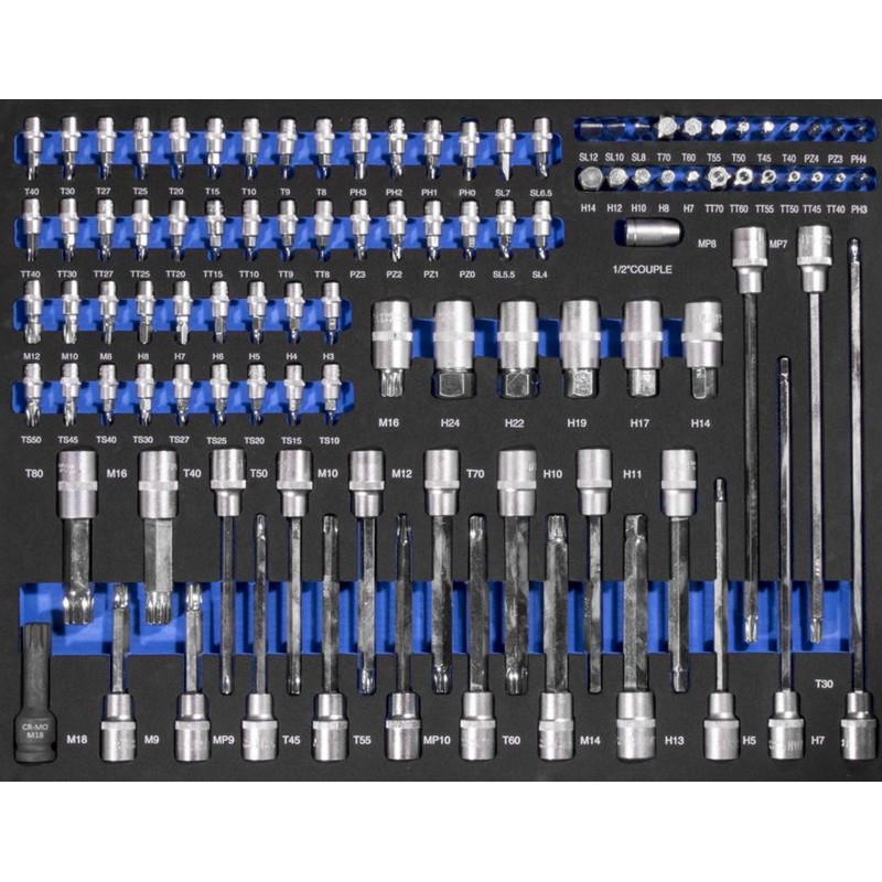 - 24 Stk. Bits SL8,10,12; PH3,4; PZ3,4; T40,45,50,55,60,70; H7,8,10,12,14; TT40,45,50,55,60,70- 48 Stk. Steckschlüsseleinsätze 1/4": T8,9,10,15,20,25,27,30,40; PH 0,1,2,3; SL 4,5.5,6.5,7; PZ 0,1-2,3; M8,10,12; TT8,9,10,15,20,25,27,30,40; TS10,15,20,25,27,30,40,45,50; H3,4,5,6,7,8