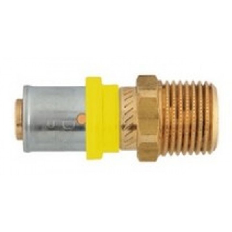 Pressfitting aus Messing f. Heizungs-u. Klimainstallationen, Doppel-O-Ring aus HNBR gelb, Edelstahl Presshülse Kunststoffring Farbe gelb, zur Zentrierung der Presshülse.