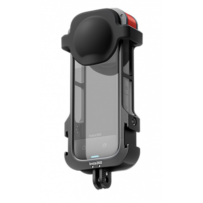 Rahmen zur Befestigung von Zubehör an der Kamera Insta360 X4. Der Rahmen schützt das Gehäuse und die Objektive der Kamera. An beiden Seiten befindet sich eine Schiene für Zubehörschuh (Cold Shoe) und an der Unterseite ein Multifunktionsadapter – 1/4-Zoll-Gewinde oder Gabel. Im Lieferumfang enthalten: Rahmen für X4, Objektivschutz.